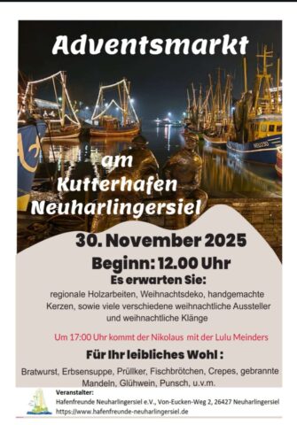 Am 30. November 2025 lädt der Adventsmarkt am Kutterhafen Neuharlingersiel ab 12:00 Uhr zum Bummeln, Genießen und Einstimmen auf die Vorweihnachtszeit ein.